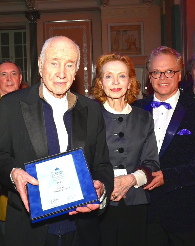 Am 6.10.2024 fand die große EKW-Gala der Heiteren Muse „Ein Lied geht um die Welt“ im Konzerthaus am Gendarmenmarkt in Berlin statt. Aus der Hand von Sibylle Prinzessin von Preußen und KS Heiko Reissig erhielt Deutschlands Schauspiellegende Armin Mueller-Stahl den renommierten Prinz-von-Preußen-Preis des Jahres 2024 verliehen. Es war ein bewegendes Ereignis mit vielen bekannten Künstlern auf der Bühne und namhaften Persönlichkeiten aus Kunst, Kultur, Politik und Gesellschaft im ausverkauften Konzertsaal. Das Publikum spendete lang anhaltenden Beifall und gab Standing Ovations für den beliebten Grand Signeur des nationalen wie internationalen Film und Theaters.